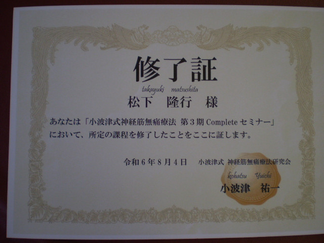 重症や難治性の腰痛や各種関節痛でご来院される方の多い当院は、その「小波津式」の対面セミナー【上級クラス】コンプリートプロジェクトの修了院です。